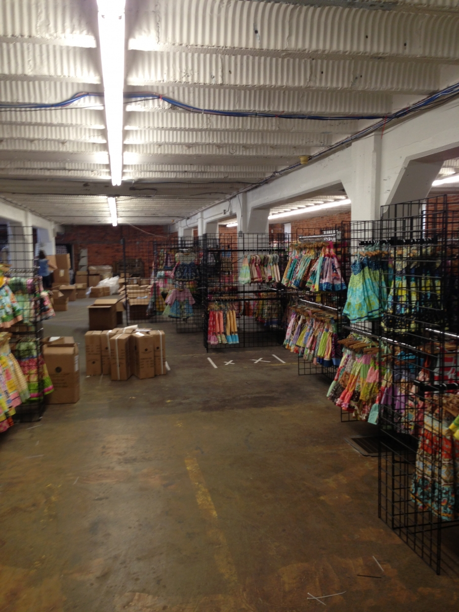 Carrie has been the pregnant superwoman today, getting everything accomplished that needs to be done and taking charge while Kiara is doing her thing in Africa! I cannot believe the stuff that she can do! Meanwhile, Melissa is learning how to cut, Patty is learning how to layer, and Emily has spent all day organizing the shelves and making them look b-e-a-u-tiful! It seems like there are new, fun jobs for everyone to accomplish. I spent an hour of the day just filling up 28 gallons of water the local grocery to use for the steamers to make all of the Art Fair dresses perfect! I must say, I did feel like a bit of a crazy person tooling around a grocery cart full of empty, and then full, water jugs. That is what makes life interesting, though, right?