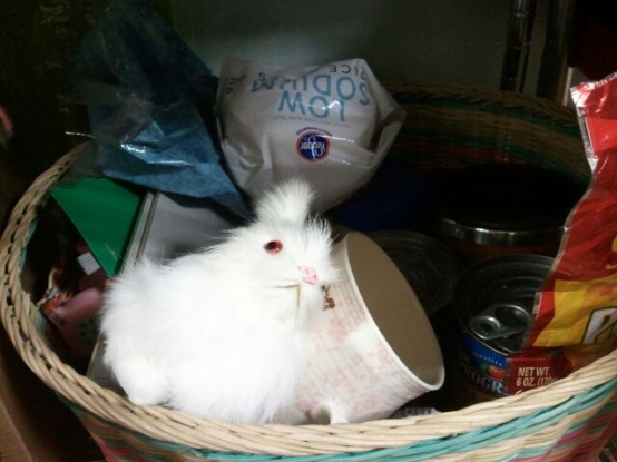 Now, I’d like to share a little known fact about me…I see bunnies. No really. I’ve seen a bunny or two around MJC’s lawn and none of the office girls believe me! Once, for a split second, out of the corner of my eye, I thought I saw a white bunny in Lynette’s trash can. Unfortunately, I chose to state that aloud. Turns out it was just paper. Then, later that day I saw a bunny hopping through the grass as I was leaving work. Immediately, I yelled for Lynette to”LOOK” and just when she turned her head, the bunny jumped behind a bush. Strike 2 for Alicia. And so now, I cannot mention the word “bunny” without my so-called hallucinations being brought up. So it only makes sense that when Kayla and Lynette returned home from China, I would find this cute lil’ guy…