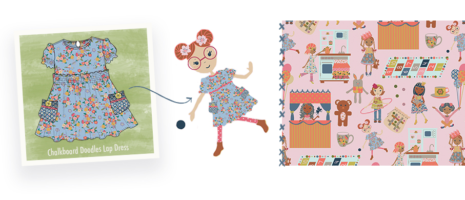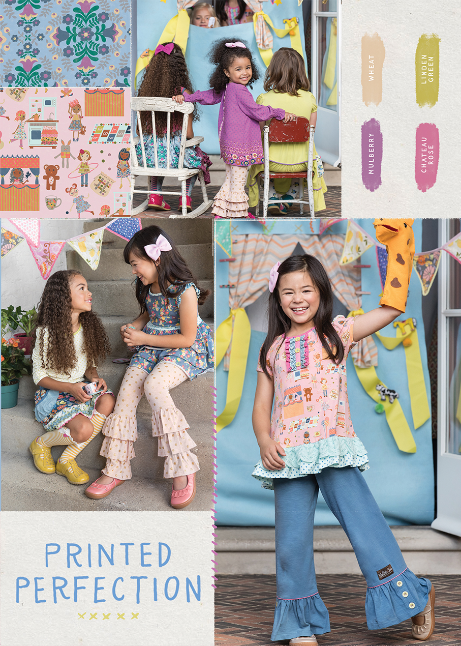 As you can see above, Maggie took our sweet Chalkboard Doodles Lap Dress from our July release and adorned our sweet MJC gal with this twirly number. From there she built a beautiful and playful scene that soon became the perfect print for our Puppet Show and Puppeteer Tunics in this collection. This whimsical print is an ode to all your beautiful girls that bring out the MJ spirit each and every day. We hope these beautiful hues and prints enhance the beauty of your Matilda Jane girl.