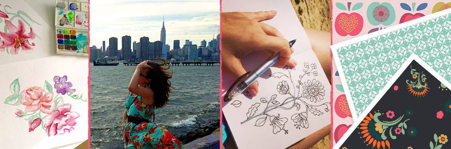 The world around me is truly my inspiration from the people and places of my day to day life, to exploring the world through hiking, road trips and more. The Polish culture is enriched with patterns and prints and this too has influenced my artistic side. As a child, I was always surrounded by the most beautiful traditional handmade costumes and paper cut out folkloristic art. I think what excites me about creating pretty patterns is how many possibilities a sketch has. How it can be put together in one way for a certain effect or slightly tweaked to get a completely different look. Also the color combinations are endless. Certain colors together may have a completely different emotional impact than others. And of course seeing the final pattern on a fabric is very exciting.These inspirations are not only influential in my work but also in my own surrealistic paintings which can be seen at maggieszott.com.