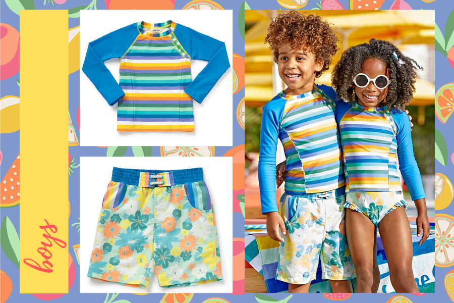 Our designers wanted to make this year’s swim collection better than ever, so they created it to fit into three color stories to appeal to any and every girl’s style! First, there’s the pretty tomato-red floral pattern offered in both girls and women’s. This pattern makes an appearance on two different girls styles — a one piece and a two piece — both with fun periwinkle polka dot accents. Next are the “sunbleached blues” — styles featuring shades of blue, aqua, orange and yellow. You can shop styles featuring these pretty hues for girls, boys, baby and tween. Last, but certainly not least, is our citrus print! Offered in both a rashguard-style one piece and a fun two-piece, these fruity styles are sure to be a hit with your gal!
