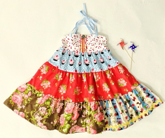 Walnut Grove – after little house on the prairie. The blue in the dress reminds me of the color of Laura and Mary’s “Sunday best” dresses, the roosters of their chores on the farm, and the cupcakes of the sweets the girls would grow wide eyed over in the Olsens mercantile.