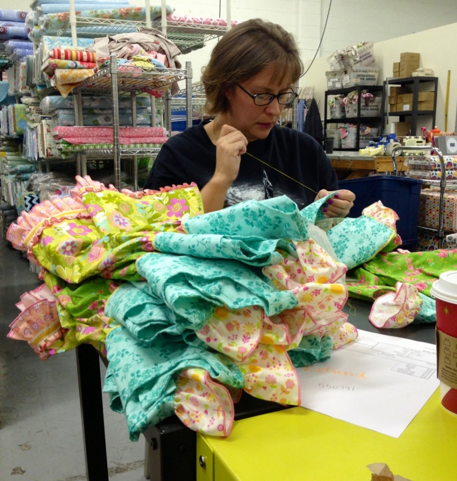 We also had a few other gals helping with sewing on buttons and folding. I feel like I can finally breath again, we were swimming in beautiful little dress…