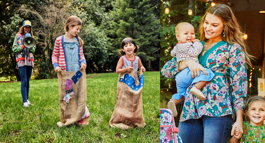 For me, the inspiration for Camp MJC was fresh. Since moving from the East Coast to Northern Indiana, I’ve spent a lot of the spring and summer at nearby lakes with my own girls. There’s a spirit of nostalgia and new traditions I wanted to capture. You see it in the color palette. We used a lot of florals and brights, but I would describe them as vintage brights, almost as if they were slightly sunkissed, giving the whole collection a magical feel.